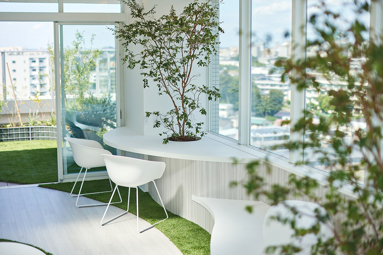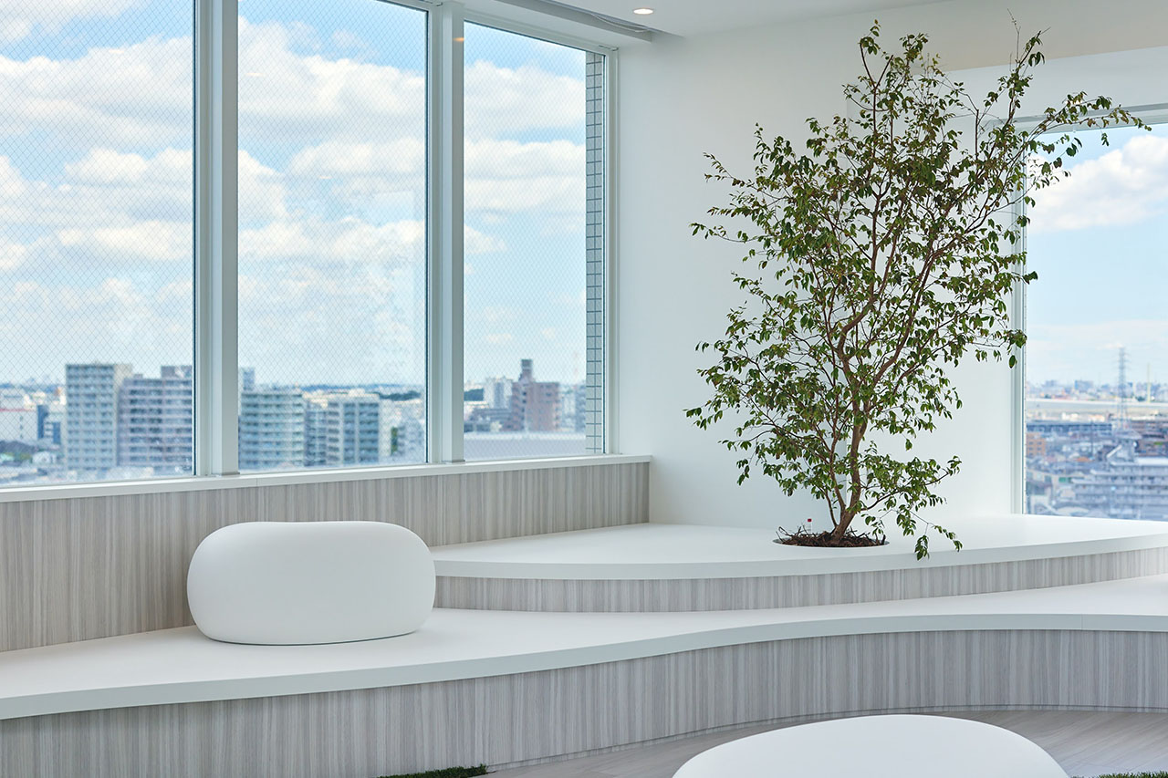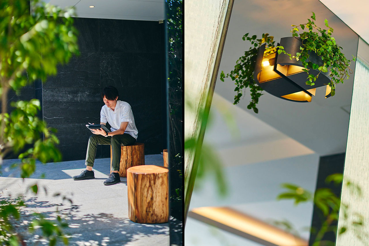 腰掛けるそばにさりげなく緑が寄り添うことで、 緊張感を和らげ過ごしやすさを体感。