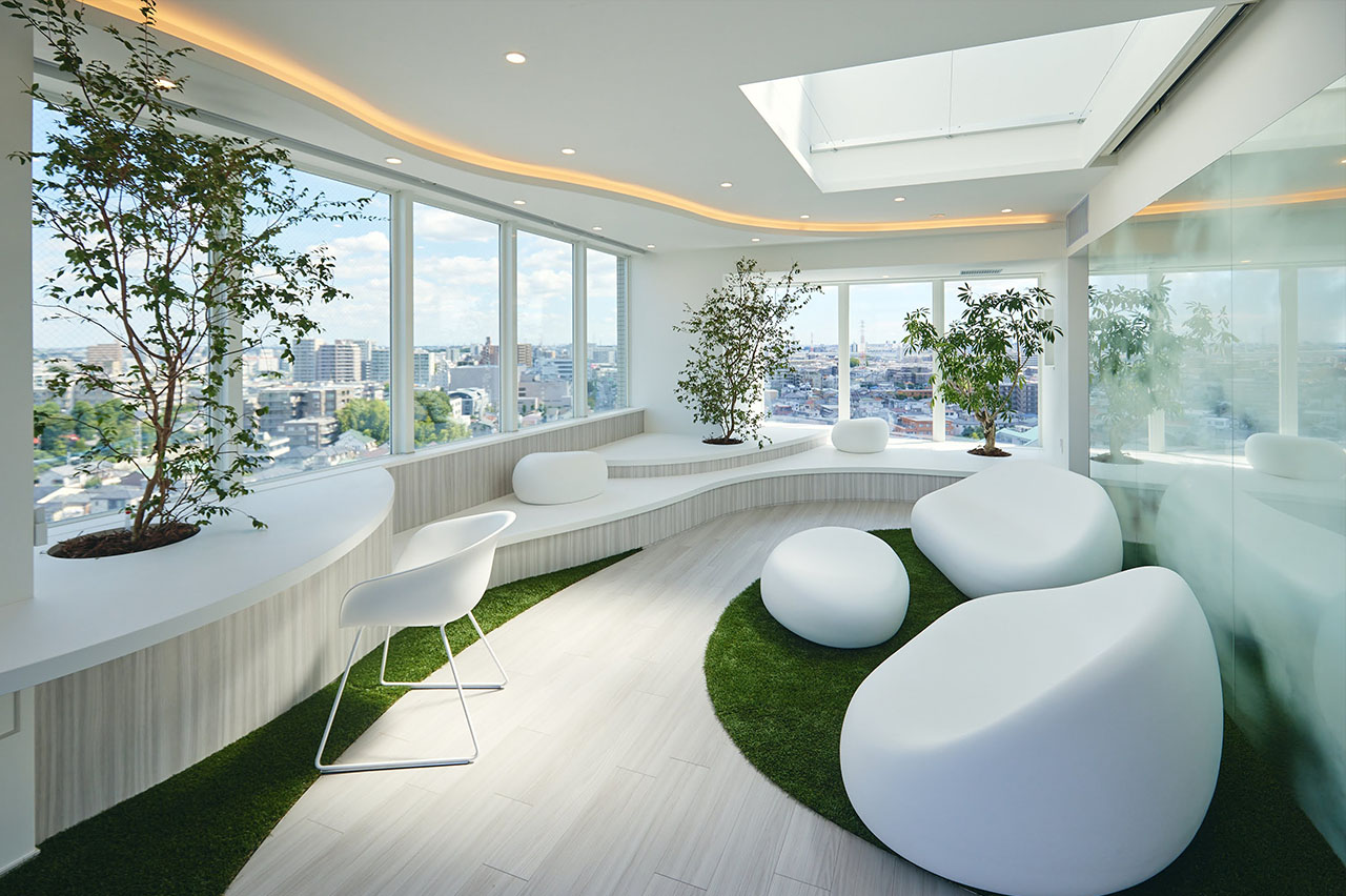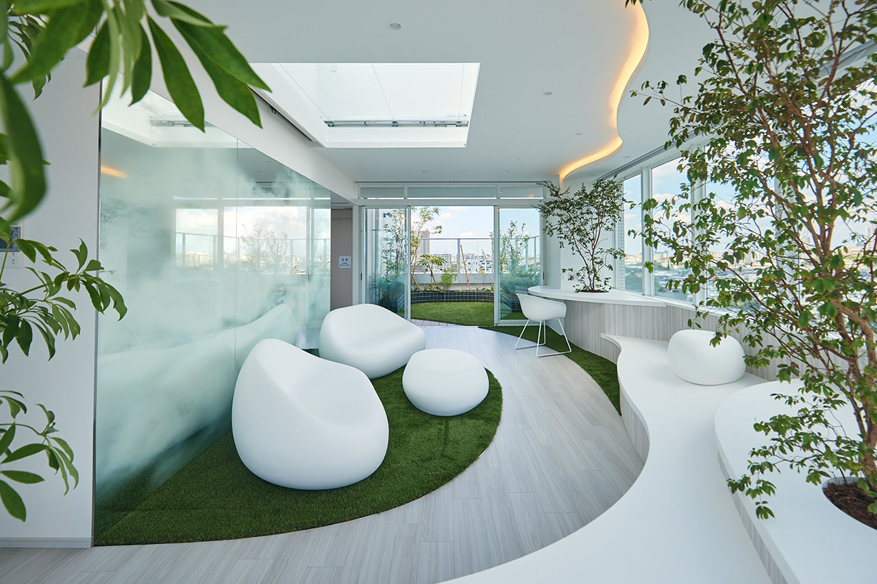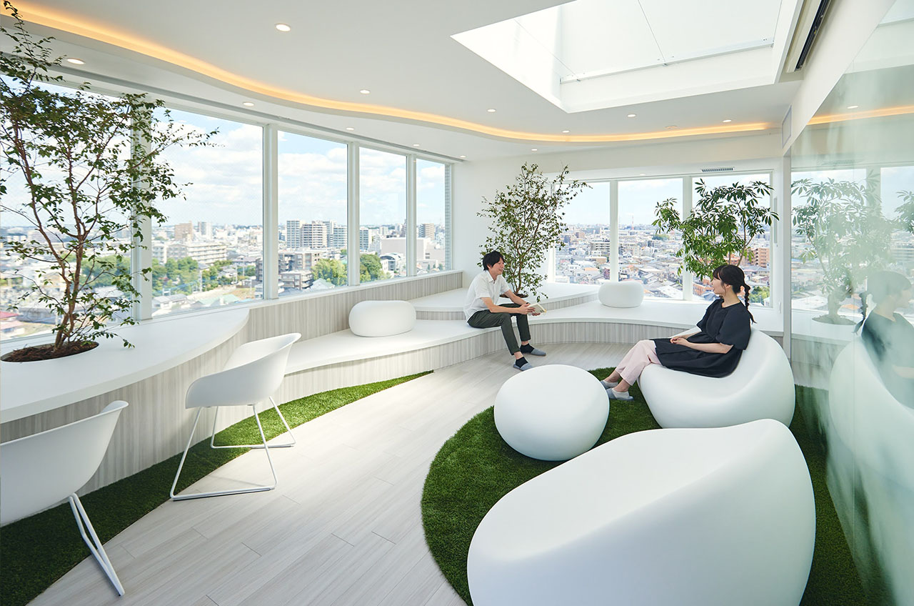腰掛けるそばにさりげなく緑が寄り添うことで、 緊張感を和らげ過ごしやすさを体感。