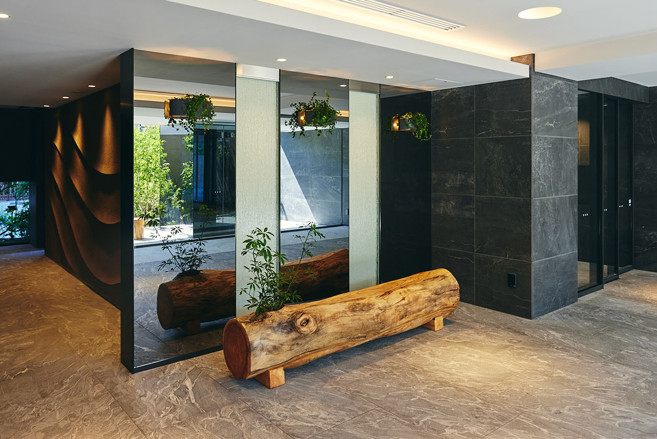 空から雨が降り、大地を潤し、空気が冷やされて霧になる。本物件ではマンション全体を通して、空と大地をつなぐ水と植物の循環を表現しました。