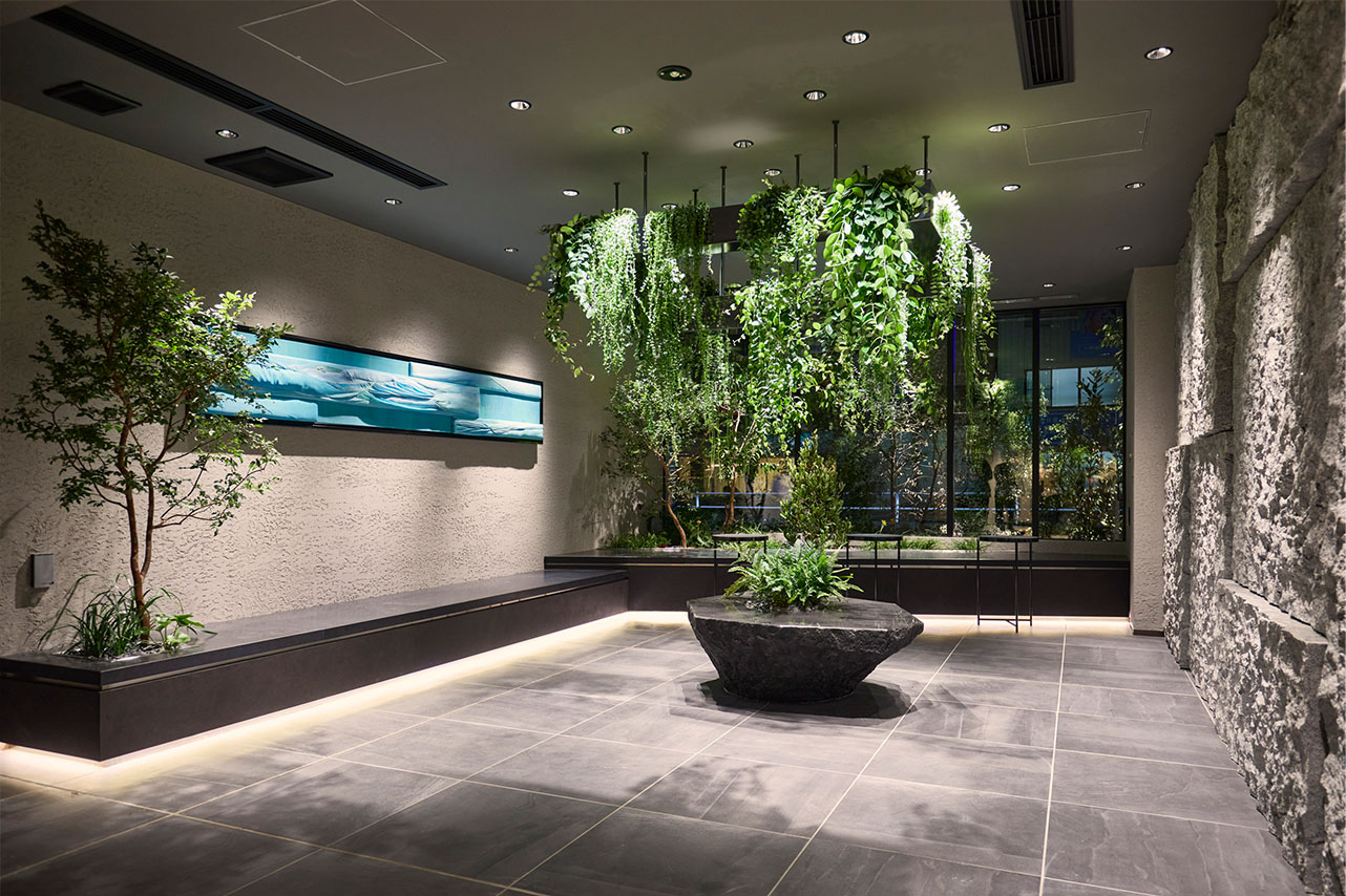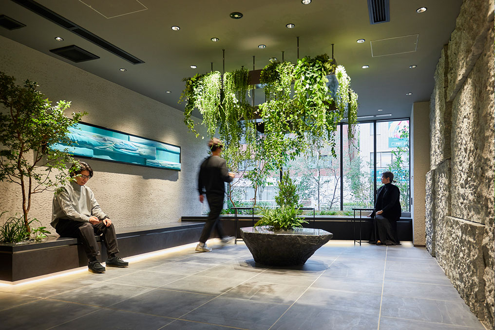 弊社の業務内容:コンセプト提案、内装デザイン設計(1Fエントランスアプローチ・1Fラウンジ)、植栽デザイン・施工(室内・屋外)、造作什器設計・施工、植栽メンテナンス