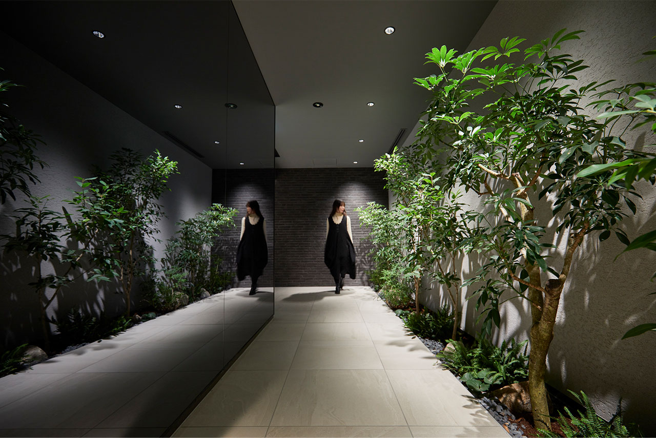 外構から連続する植栽ボリュームが、エントランス、ラウンジ、そしてオプションプランに応じて各居住者の占有部にまで繋がり、常に暮らしのどこかに植物が寄り添う計画に。代々木上原の街並みや住人の感度の高さを受け、人々が潜在的に持っているそれぞれの個性や感性を、植物の持つ美しさと心地よさによって刺激することで気づきを与え、日常的に潤いをもたらす空間づくりを意識しました。
