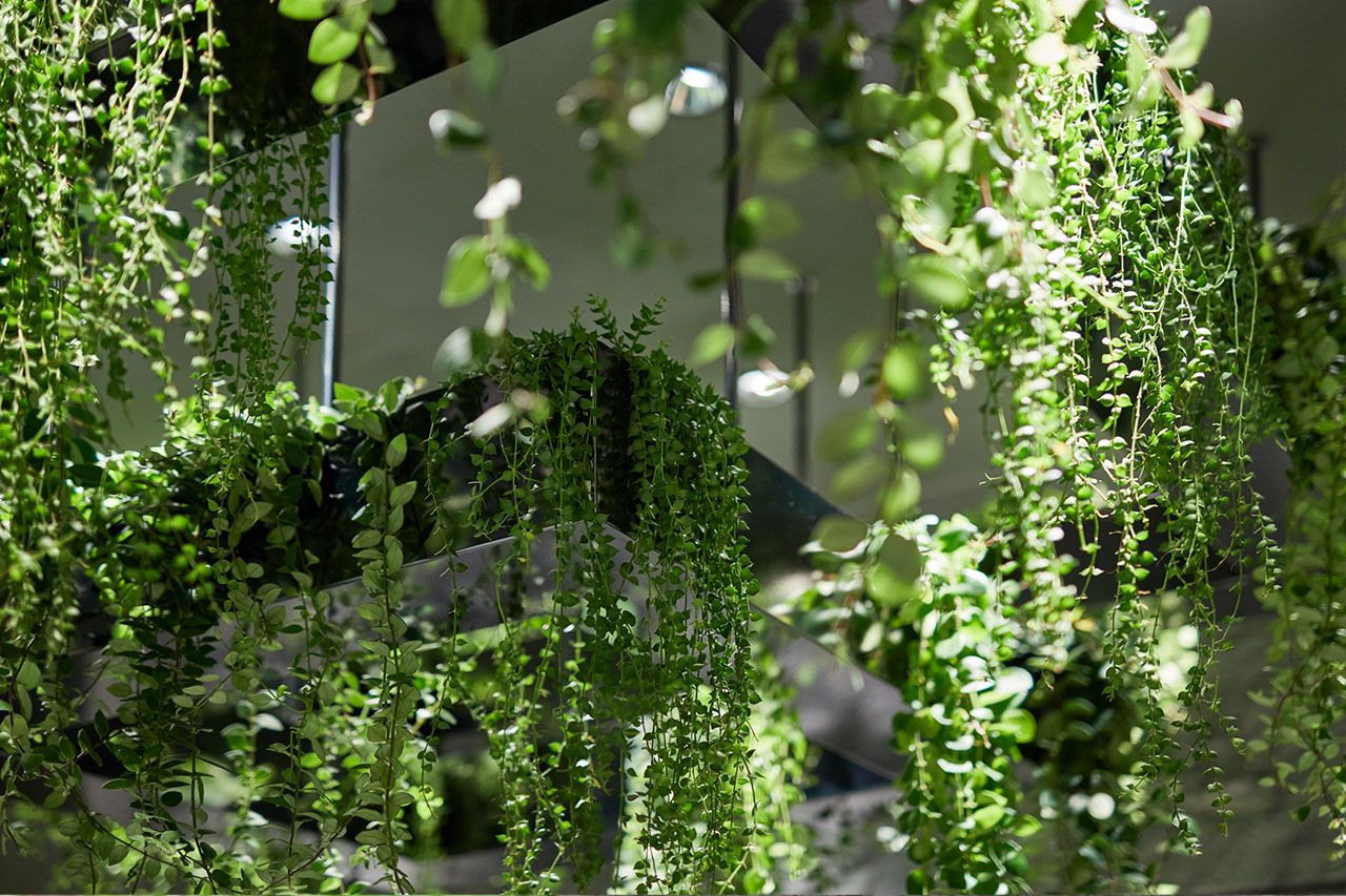 植栽の対面にミラーを設え、両側に植物があるように見せることで