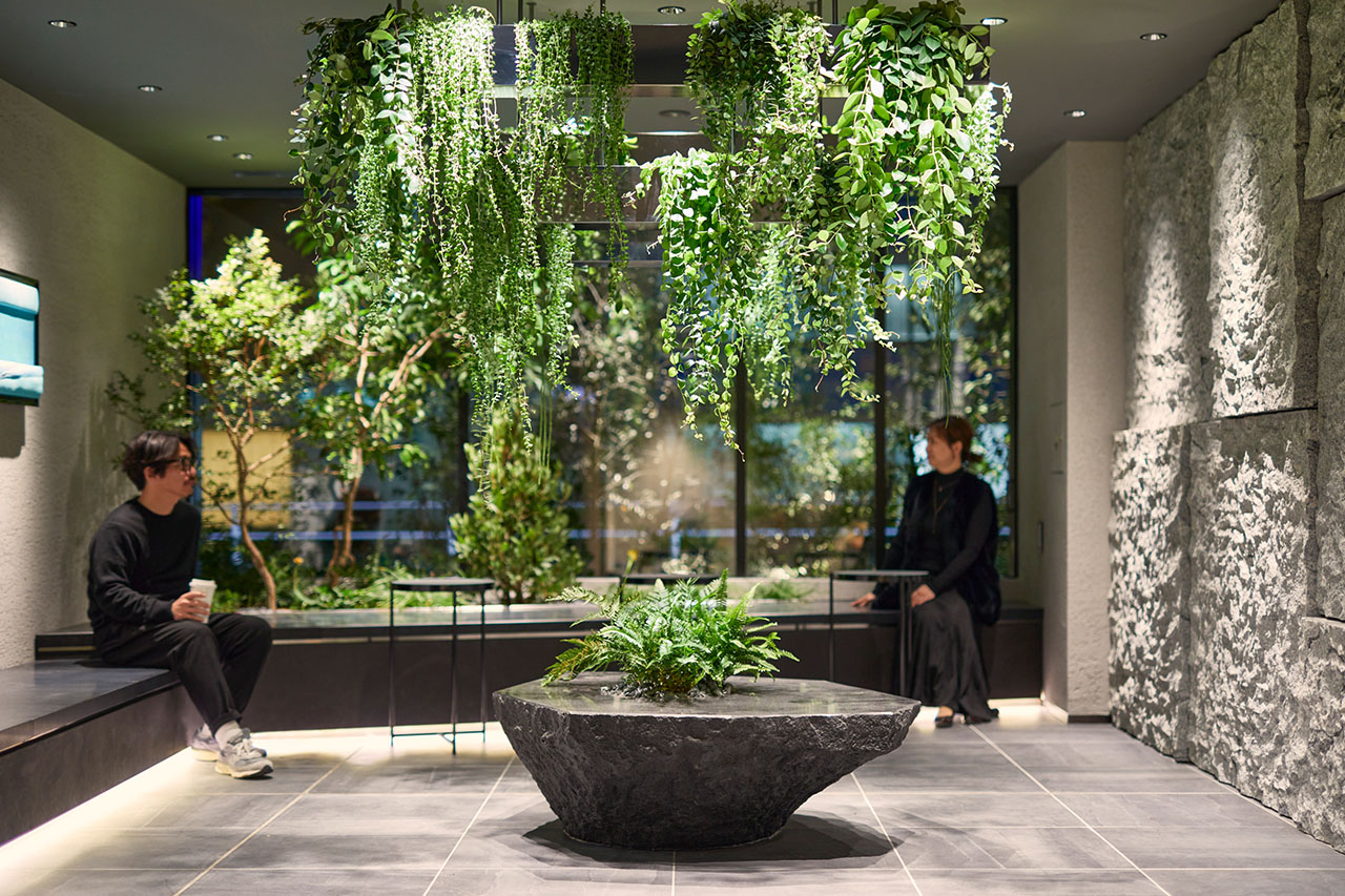 外構から連続する植栽ボリュームが、エントランス、ラウンジ、そしてオプションプランに応じて各居住者の占有部にまで繋がり、常に暮らしのどこかに植物が寄り添う計画に。代々木上原の街並みや住人の感度の高さを受け、人々が潜在的に持っているそれぞれの個性や感性を、植物の持つ美しさと心地よさによって刺激することで気づきを与え、日常的に潤いをもたらす空間づくりを意識しました。