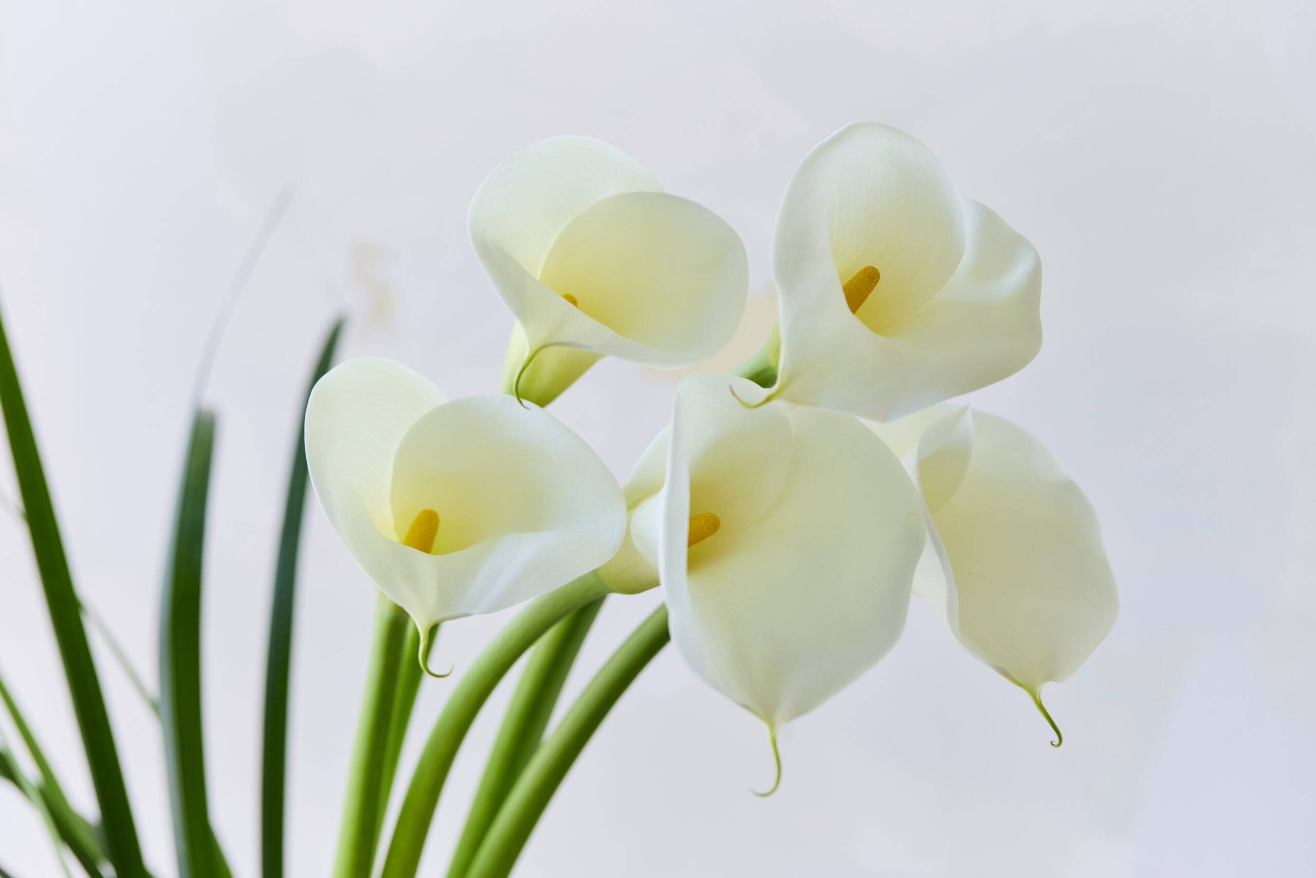 しなりがあり、茎で曲線を表現できる花はそう多くありません。カラーは可憐なイメージもあれば、儚い繊細さもあり、格好よくまとめることもできる。見せ方によって印象がいかようにも変わるところが魅力的です。ただ、しならせすぎると折れてしまうので、思い通りに行きそうで行かない、クリエイター心をくすぐる花です。