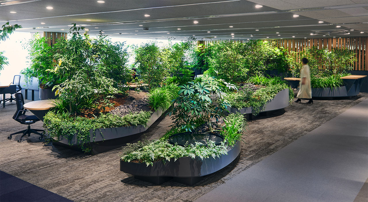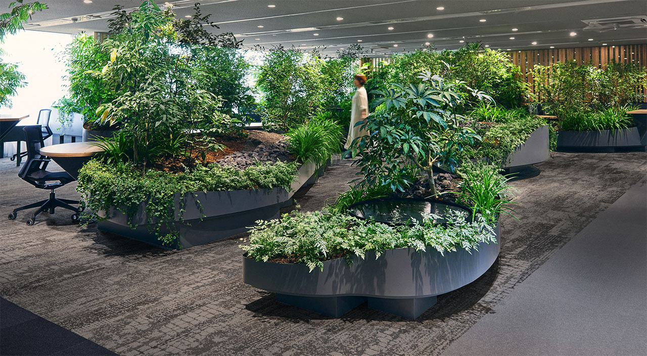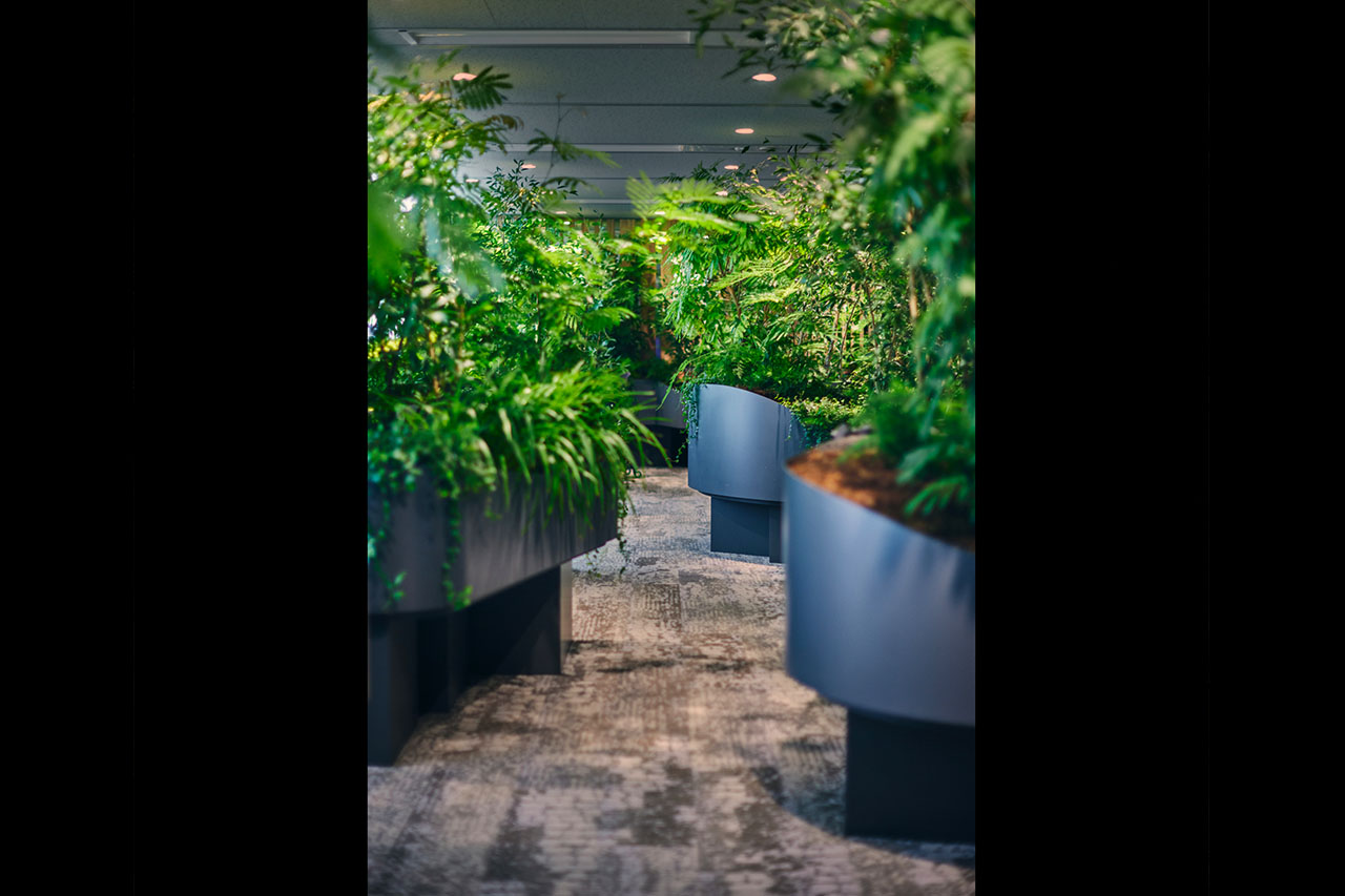 これまでparkERsは、トヨタ自動車株式会社 未来創生センターと株式会社豊田中央研究所が共同で進めるGenki空間®研究において、空間デザインの提案および施工に携わってきました。 そこで得られた実験の成果を、今回のオフィス空間に反映。癒し効果が期待される植物で空間を構成し、森の中に潜っていくような、身を隠せるような包まれ感でグラデーションをつけたレイアウトとしました。