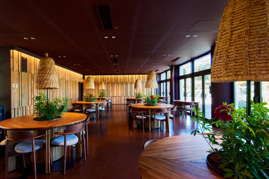 レストラン内観。印象的なトンネルは、建築家ブルーノ・タウトの指導のもと群馬県で育まれた伝統工芸である「竹皮編み」で手編みしたもの。レストランへ出迎える通路としての演出と、季節の花を飾ることができる花籠としての機能も備わっています。