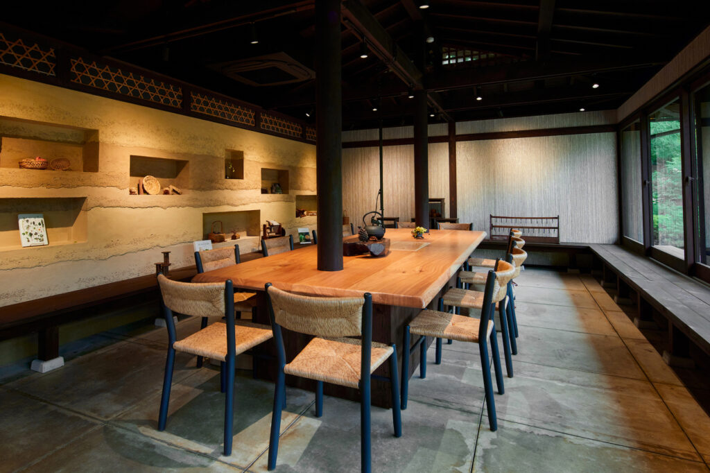 古民家を模した甘味処には木製サッシを取り付け雨天時にも対応できるよう和食堂へリノベーション。内装にも、蚕の糸でつくられたクロス、養蚕の小屋で使用される籠を意匠的に用いるなど、群馬ならではの文化を感じられるような仕上げに。