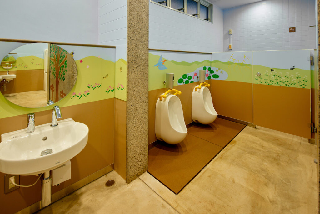 園内での時間を快適に過ごせるようトイレ設備もリニューアル。写真のキッズトイレは、生きものや季節の植物のオリジナルイラストが可愛らしく、つい足を運びたくなる演出に。小さなお子さまもご家族と安心してご利用いただけます。