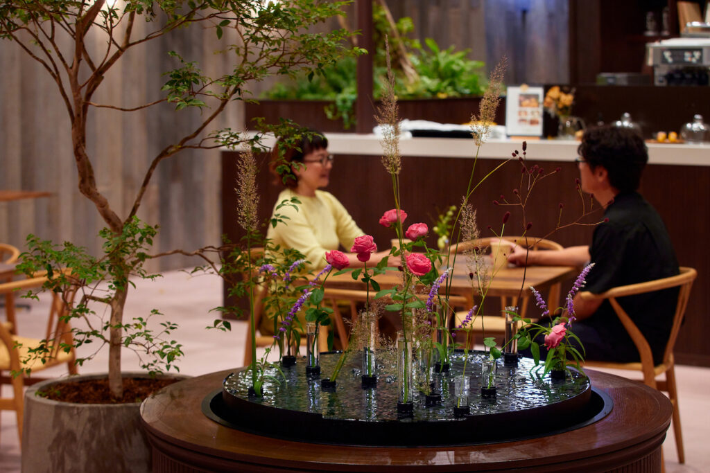 水音が心地よく響く水盤のディスプレイは可動式。ゆらぎが美しい水面には、園内で採れた新鮮な花をいけられるつくりになっており、自然に咲く姿とはまた違う魅力を表現できるスペースとしました。