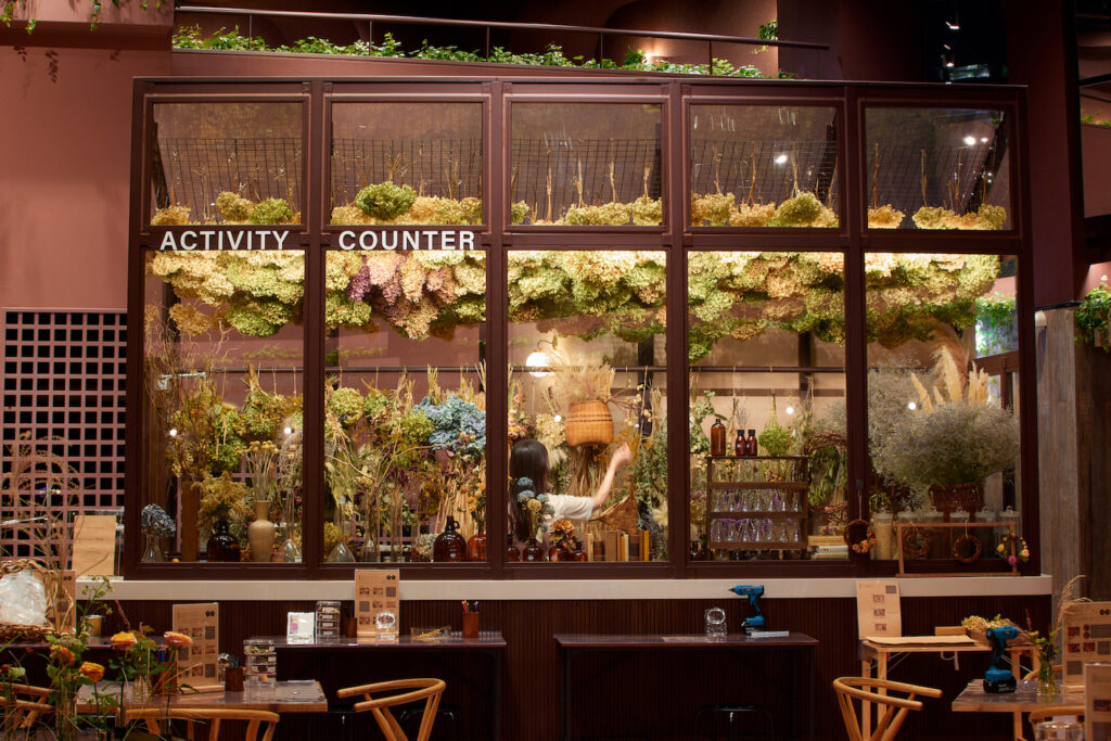 直径5mの巨大なフラワーシャンデリアの下では、カフェやアクティビティを楽しみながらゆっくり流れる時間をお過ごしいただけます。