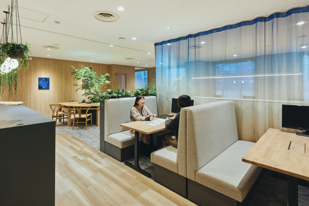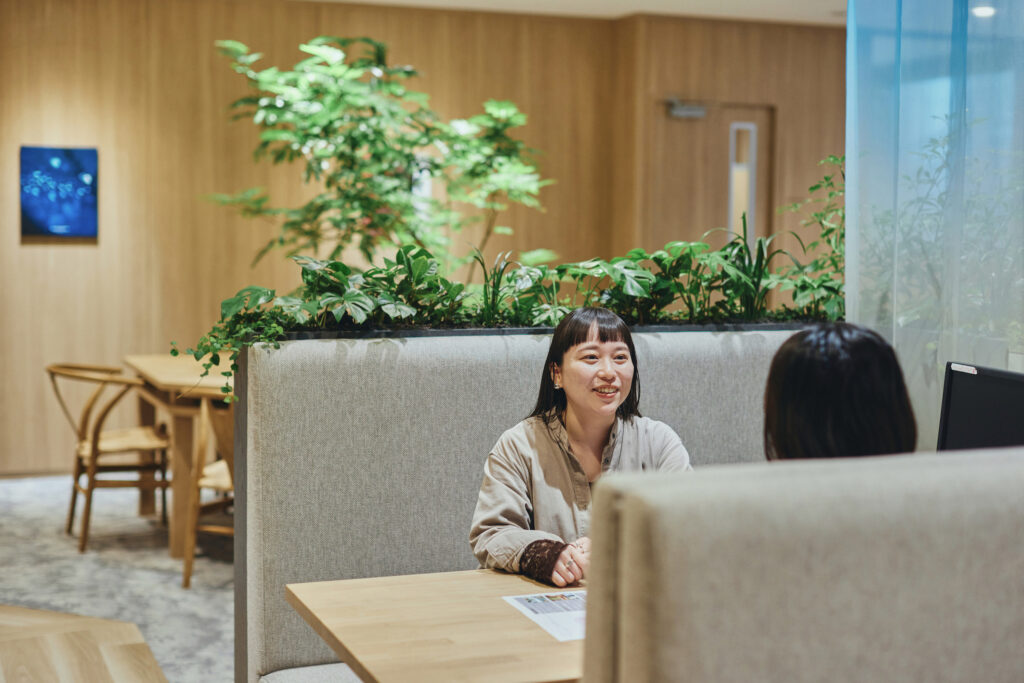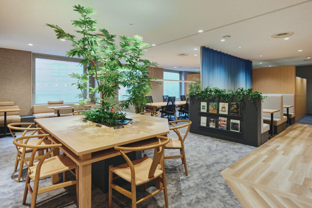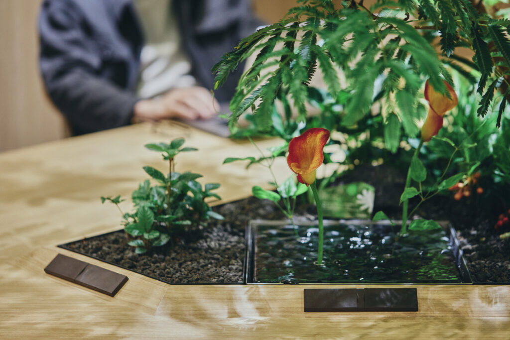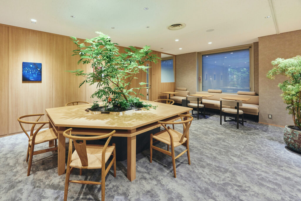 自然の中に行くと会話が柔らかくなるように、コミュニケーションが生まれる場所に緑を、他人を柔らかく感じたい場所に水音を。集中して仕事をする場所には、大きな木影が揺らいだり、季節の花や公園の香りを感じられる仕掛けをレイアウト。樹木は植物のある心地よさをより体感的に感じていただけるよう、人の滞在時間も考慮しコーディネートしました。