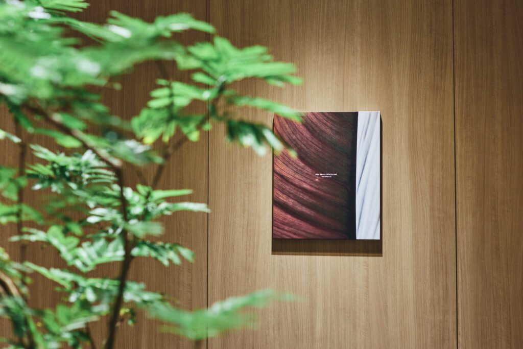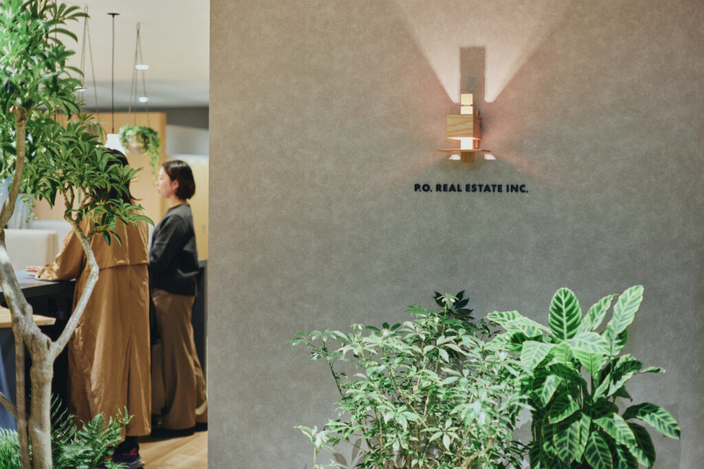ロゴサイン上には、同社が保有する文化財住宅である土浦亀城邸とゆかりのあるフランク・ロイド・ライトのデザイナーズ照明を設え、同社の文化的な思想に繋がるアートの一つとしています。植栽には、空間全体を通してアクセントで特徴的な葉を入れることで豊かな表情を引き出しました。