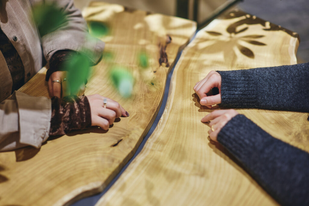 人が集まるマグネットスペースとして設置したカウンターには、無垢材ミミ付の温もりを感じる天板や、職人技を感じる吹きガラスのペンダント、個性豊かなハンギングの植物に多様な葉影。自然現象や自然素材の美しさ・面白さとして"感受性スイッチ"を散りばめました。