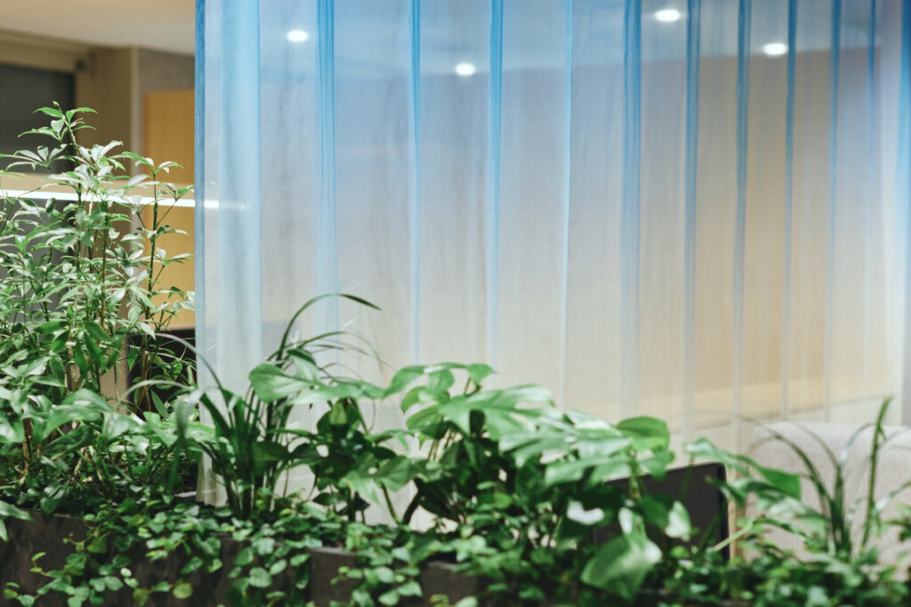 オフィスを見渡すと、葉の艶や瑞々しさ、陰影といった植物のさまざまな表情にフォーカスしたアートパネルや、朝日をイメージしたグラフィックカーテンを視覚的に体感できるよう計画。
