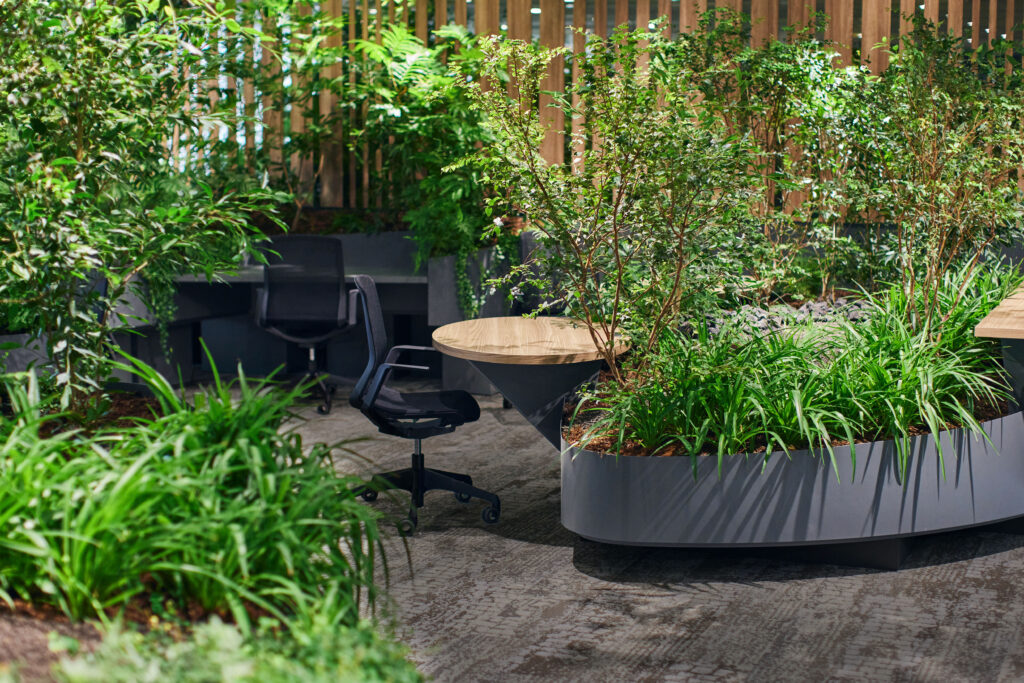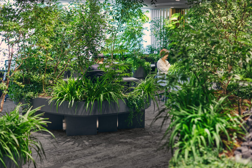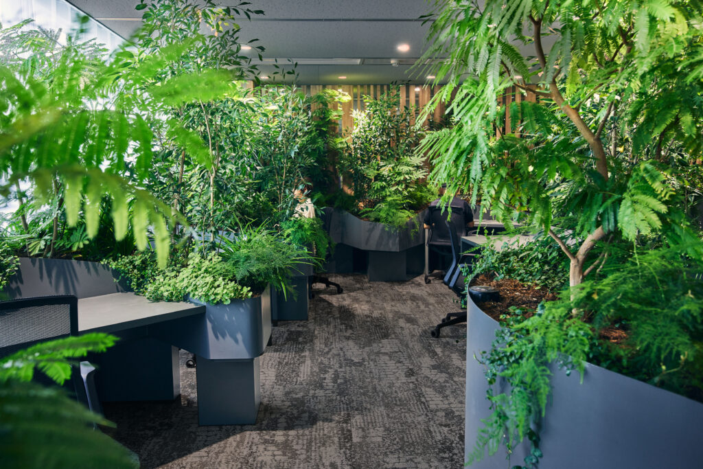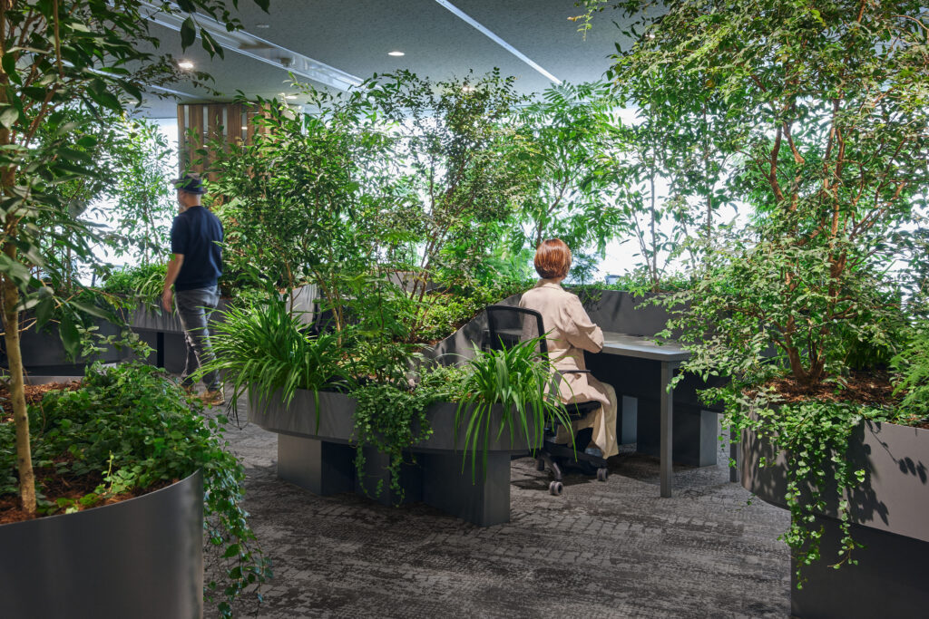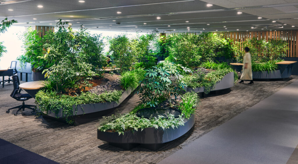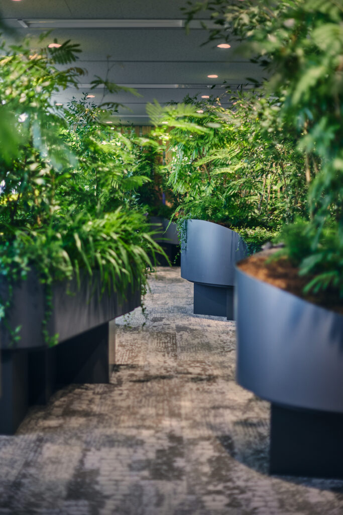 そこで得られた実験の成果を、今回のオフィス空間に反映。癒し効果が期待される植物で空間を構成し、森の中に潜っていくような、身を隠せるような包まれ感でグラデーションをつけたレイアウトとしました。